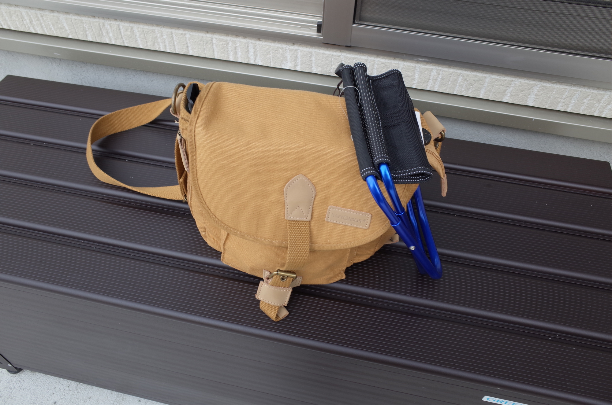 手がすぐかかるのでハンドガンのホルスターと同じようにすぽっと引き抜けます。使い終わったら針金で固定してある大きなダンプポーチの口にすぽっと入れるだけ。フードは写真の通りつけたまま、レンズキャップ外してウロウロできます。