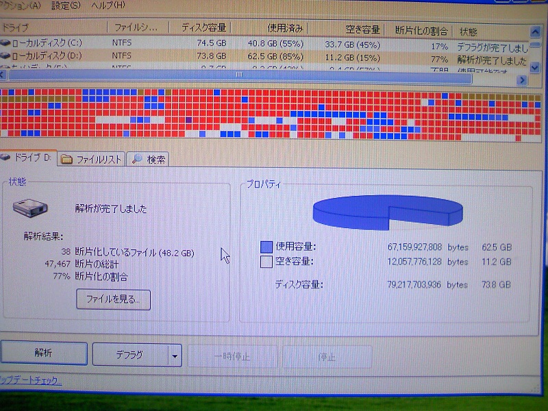 なんだこれは……ほぼHDDが断片化しているだとっ!? 驚きを隠せません、普通は多くても40パーセント程度だったりする断片化がなんと70パーセント台というorz