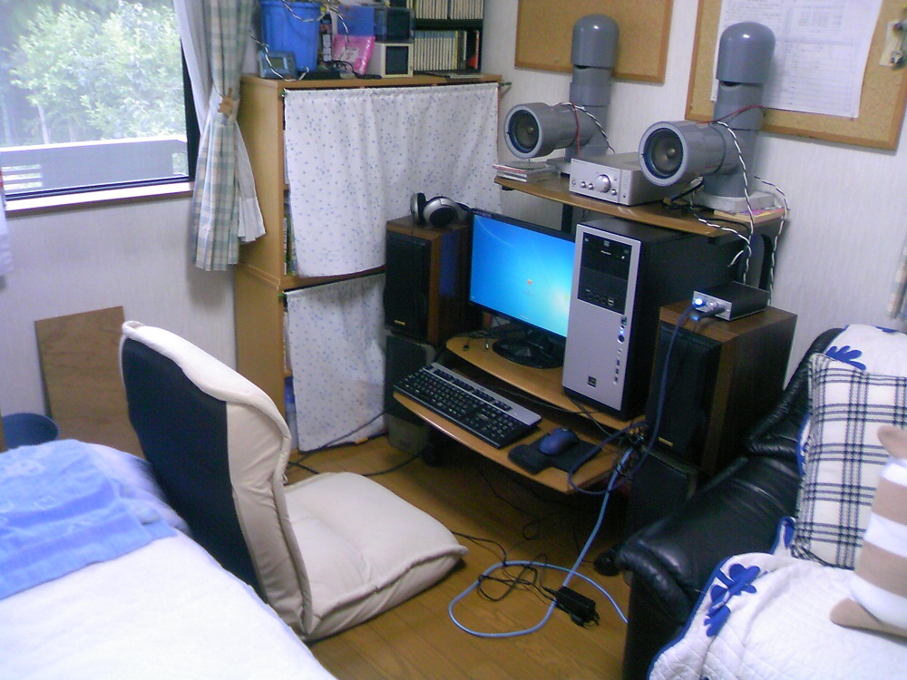 引越し後の肥やし部屋。横の棚と塩ビ管スピーカはそのまま、アンプだけどかしてそこにPCを置いてあります。