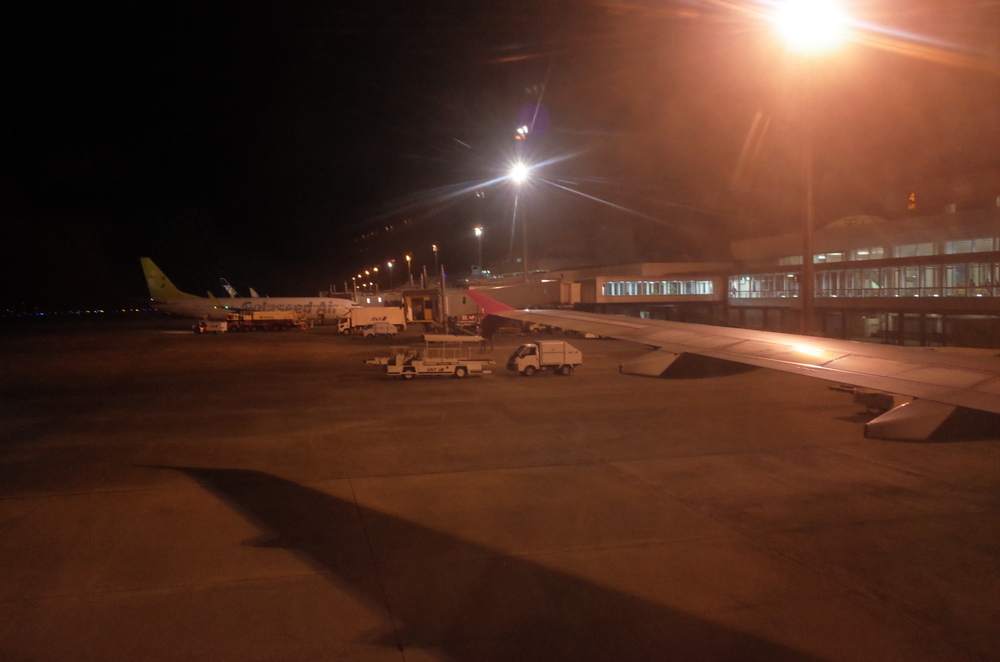 さて鹿児島空港に到着です。9時近いのでかなり真っ暗。空港で物資補充しておこうと思ったのですが、見える限りの空港内の店はすべて閉まっていたため着陸時に窓からチラッと見えた空港横のセブンイレブンへ