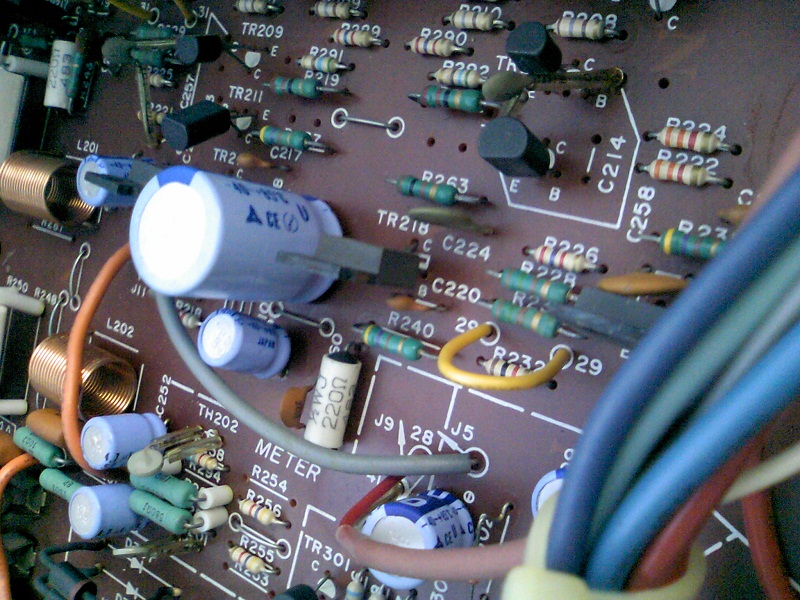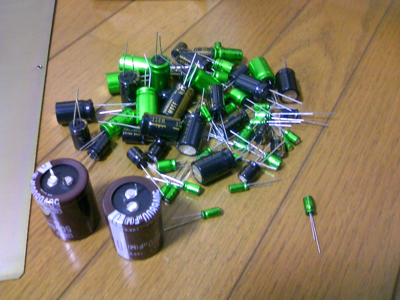 写真ではわかりにくいと思うのですが、オレンジ色をした丸い円盤(ホタテ?)だったり、青色の四角形のガムみたいな形だったりするのコンデンサです。
