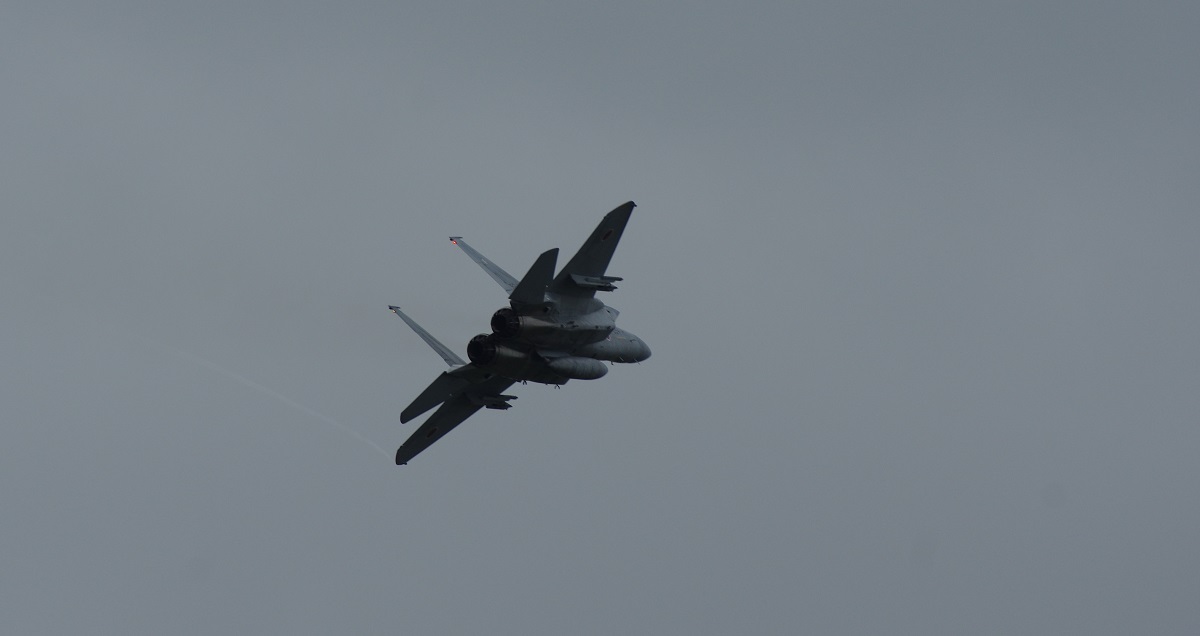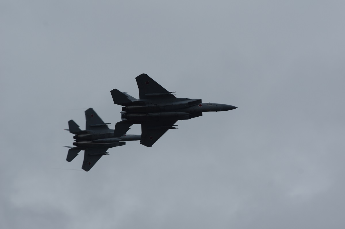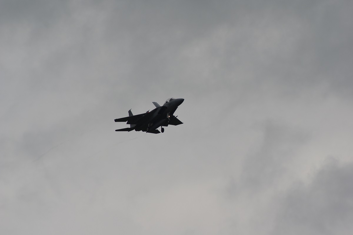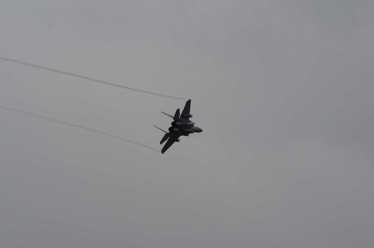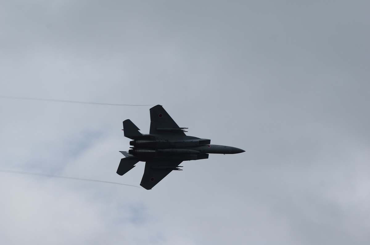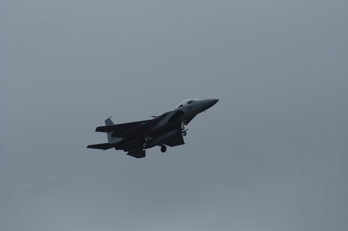 F-15キター! って思ってたら、なぜかレンズを押しのけて割り込んでくる後発のおじいさんたち。会話を聞くと元ここに所属していた方のようなのですが、後から来て前列待機の自分の前に割り込まないでいただきたいorz
