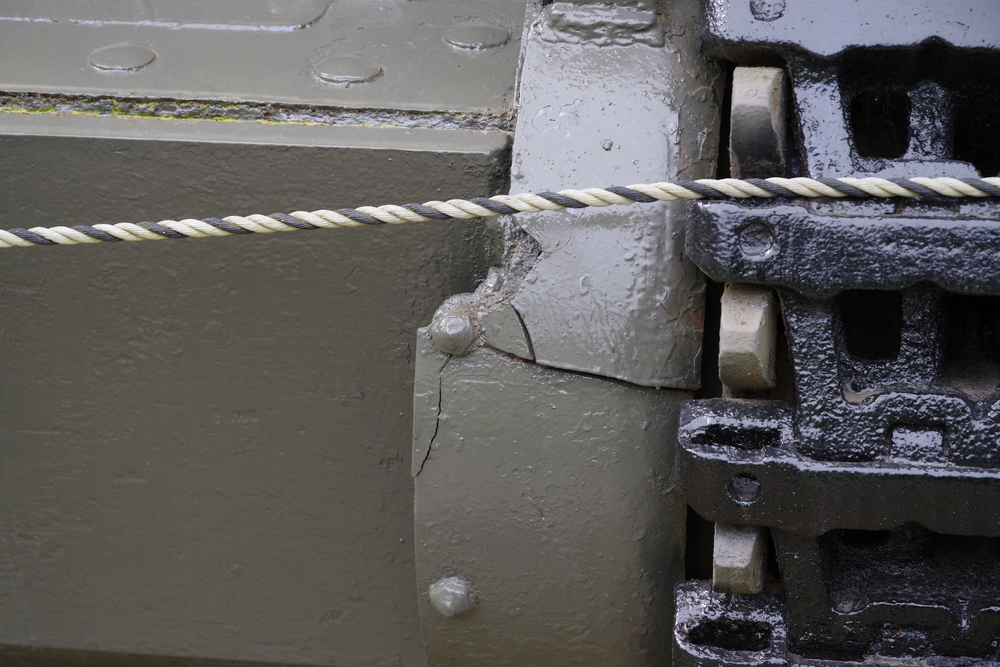 粗悪な鉄で作ったからから、いたるところでクラックや部品脱落が発生しています。89式がメンテ+修理でまだ自走しているのに対して、こちらはどう考えても強度的に無理そうです。