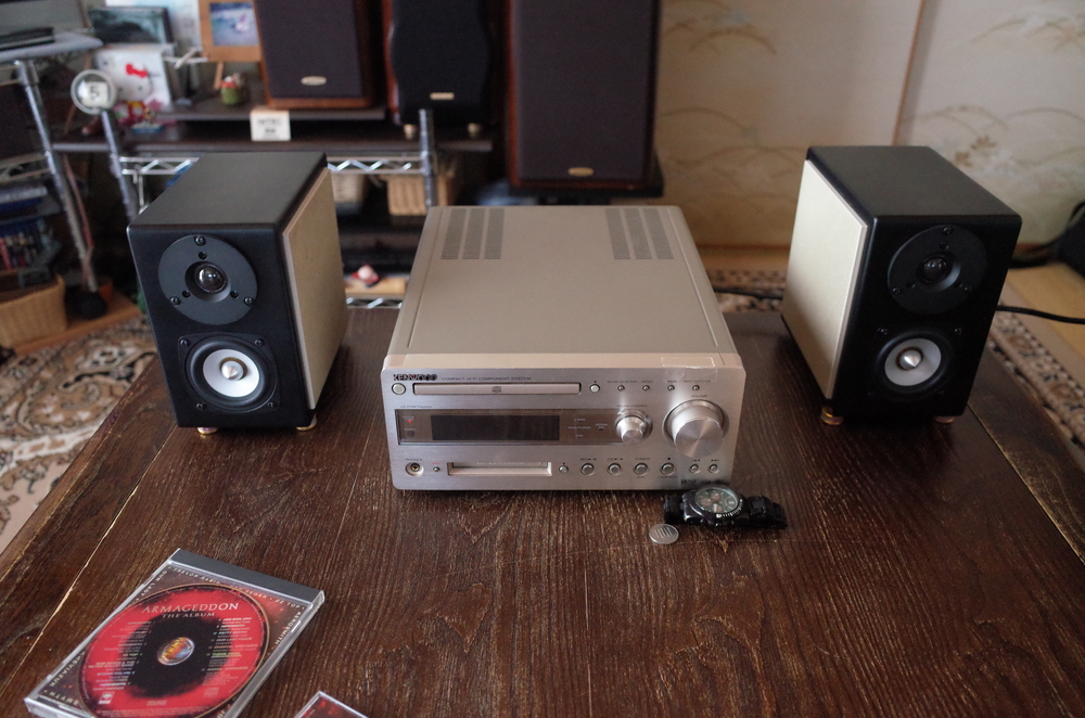 アンプは一度手放したもののハードオフで故障投売りしていたR-K700をチョイス。冷却ファンから異音がしていたので故障扱いだったのですが、ただのファンベアリングの油漏れだったのでグリスアップしなおしで問題なし。CDもMDもバッチリです。