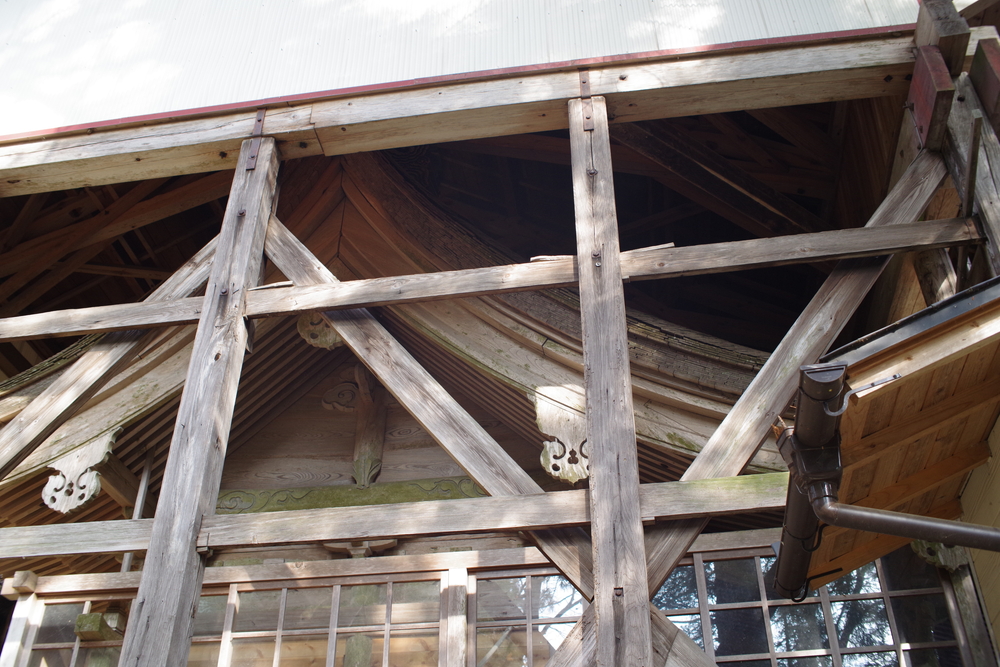 側面を見ると、古い神社に新しい屋根で傘を着せている形なのがわかります。