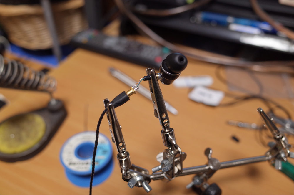 まずは断線状況のチェックです。んー、んんー? どうも片側のイヤホンユニット根元をぐじぐじすると音が出るので、ココが調子悪そうです。しかしあちこちケーブルがヨジれてたり欠けてたりするのでいっそのことリケーブルします。