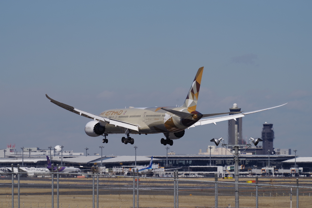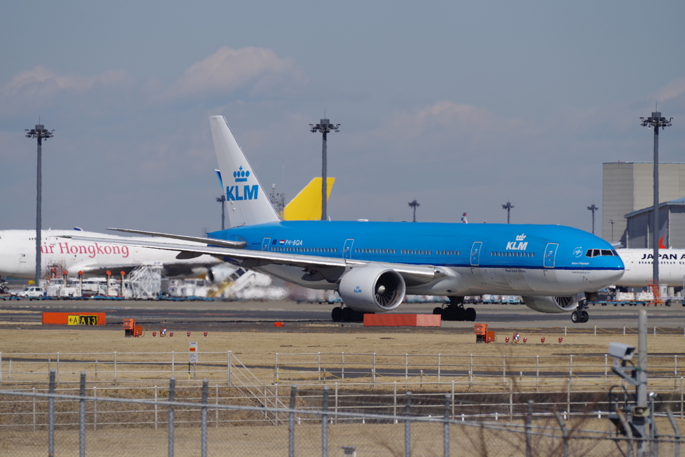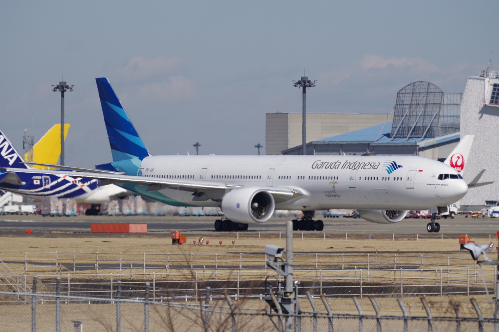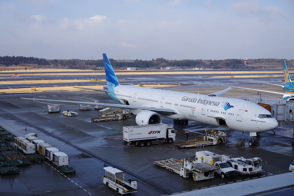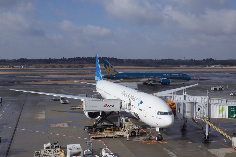 成田空港到着。バスまでちょっと時間があるのでいつものガルーダ航空777-300ERでも眺めてましょう。あと朝ごはんうどん。