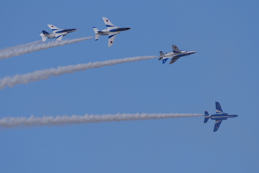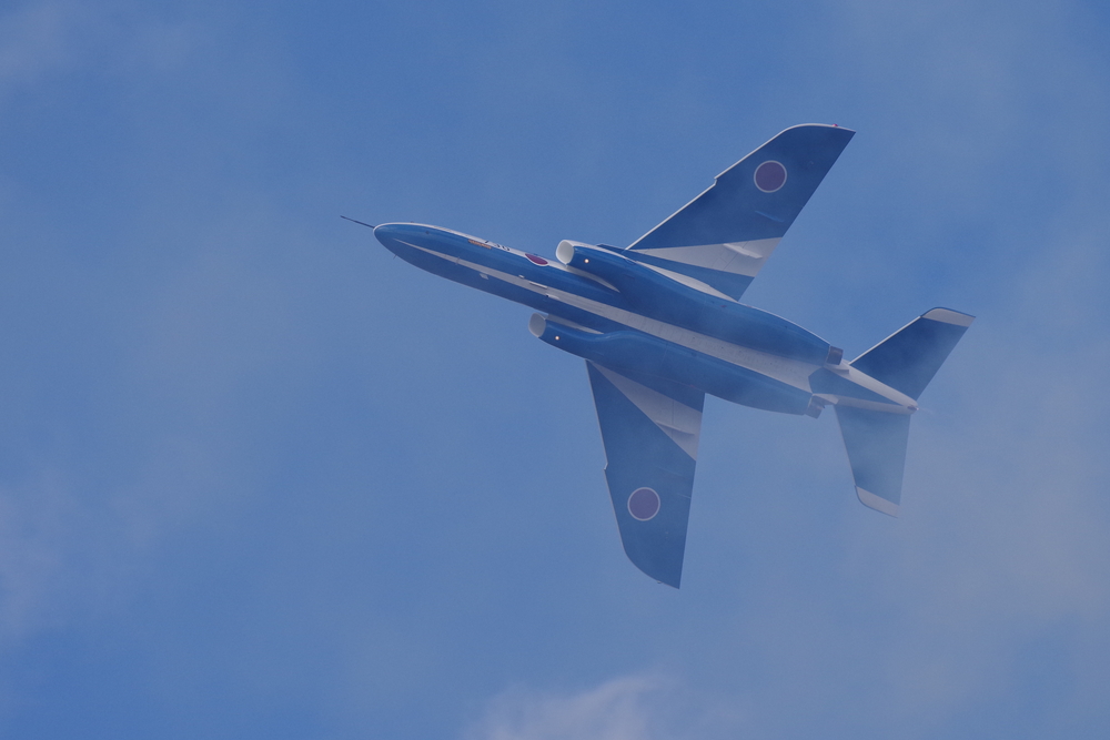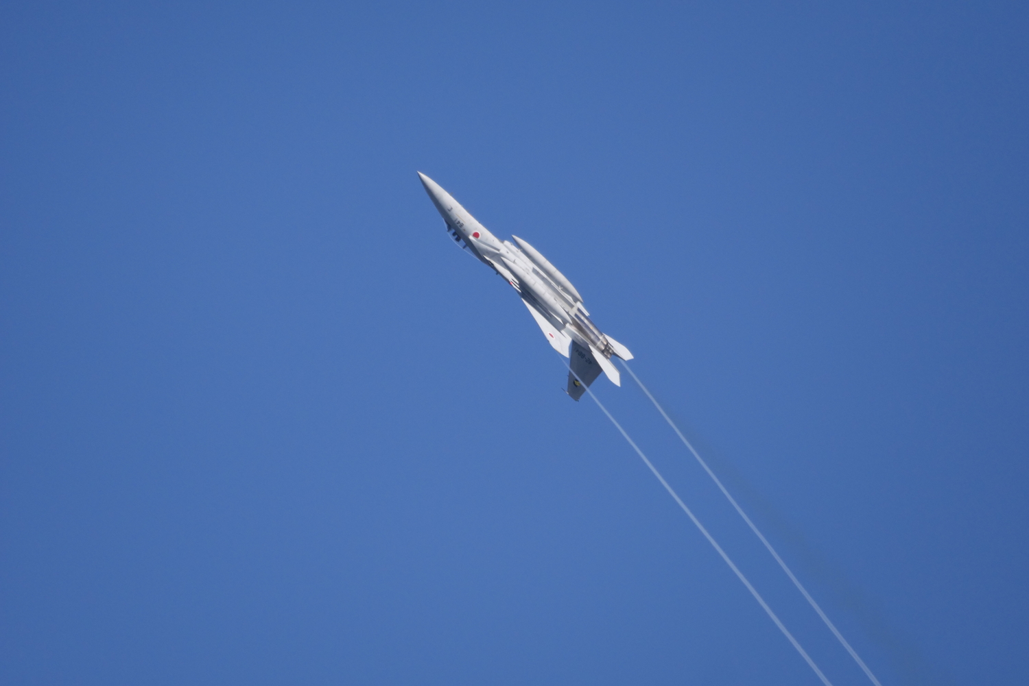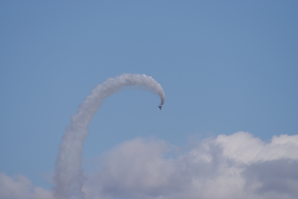 開放駐車場からは、機動飛行や演技している航空機はかなり小さくしか撮れない。G7+100-400mmの最大望遠+デジタルテレコンMでもこのぐらいにしか写らない。というか動きがキレキレすぎて望遠がんばってもファインダーに入らない。ダットサイトの重要性をすごーく感じる。