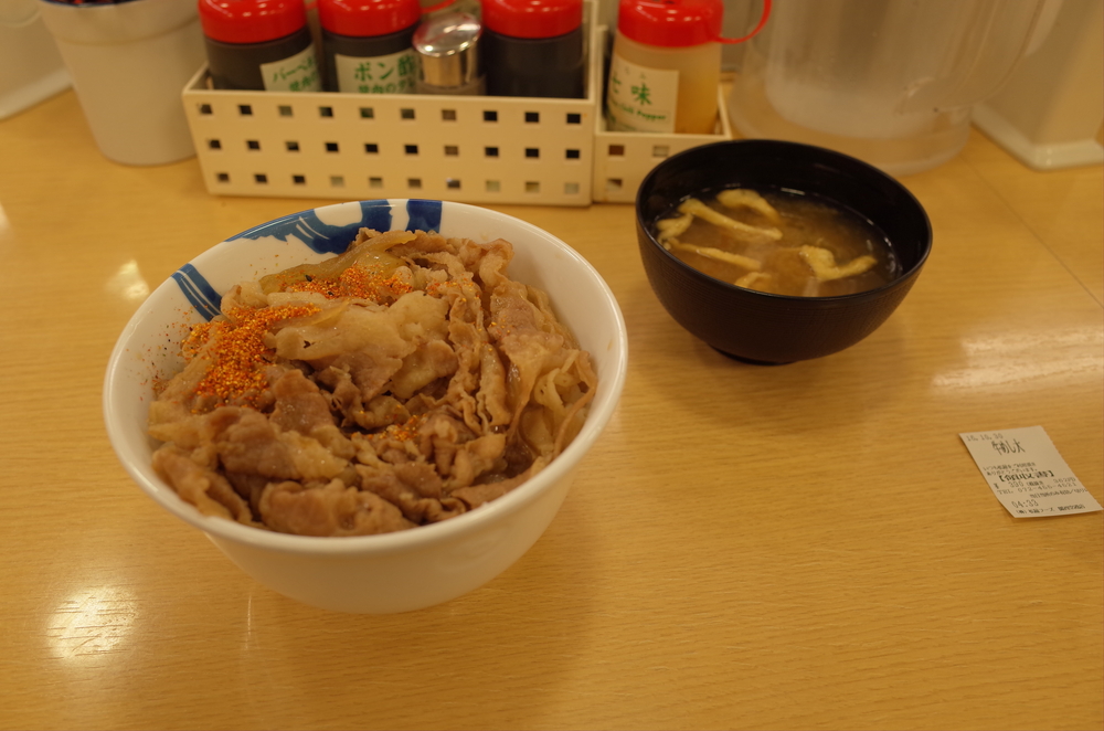 牛丼食ってエネルギーMAX! 店員さんも客が居なくてヒマなようですこーしお話したり。