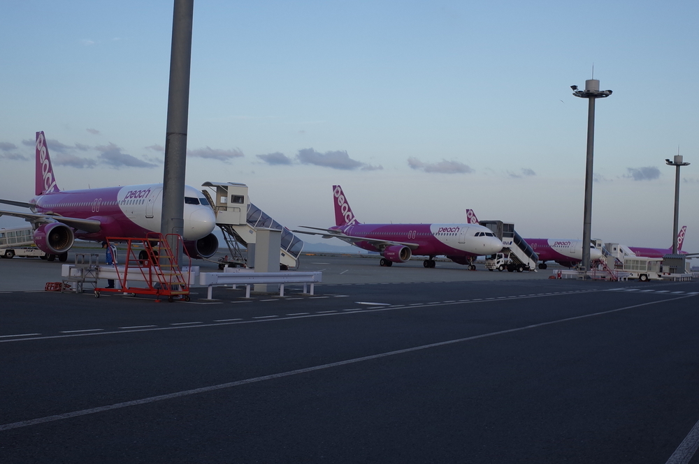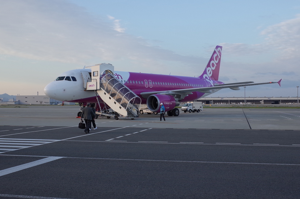 始発のピーチなのにすんごい人が乗ってる。さすがピーチ。そして愛も変わらず座席は狭いのでした。