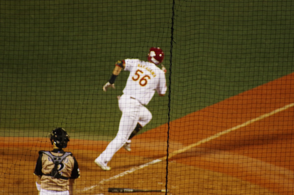 AFだとどうしてもピントがファール対策ネット(2枚目の走っている選手)に言ってしまうので、最初から諦めてMFで撮影。ナイターのためフォーカスエイドがうまく効かないため勘で撮影。