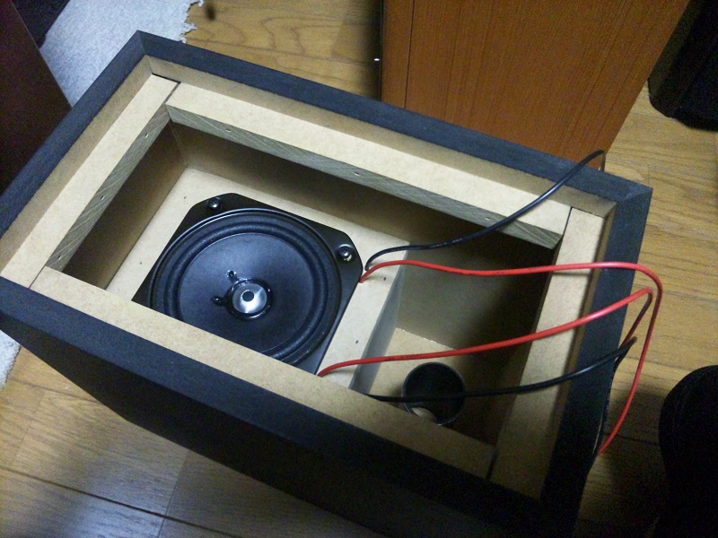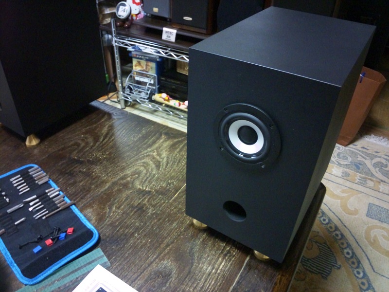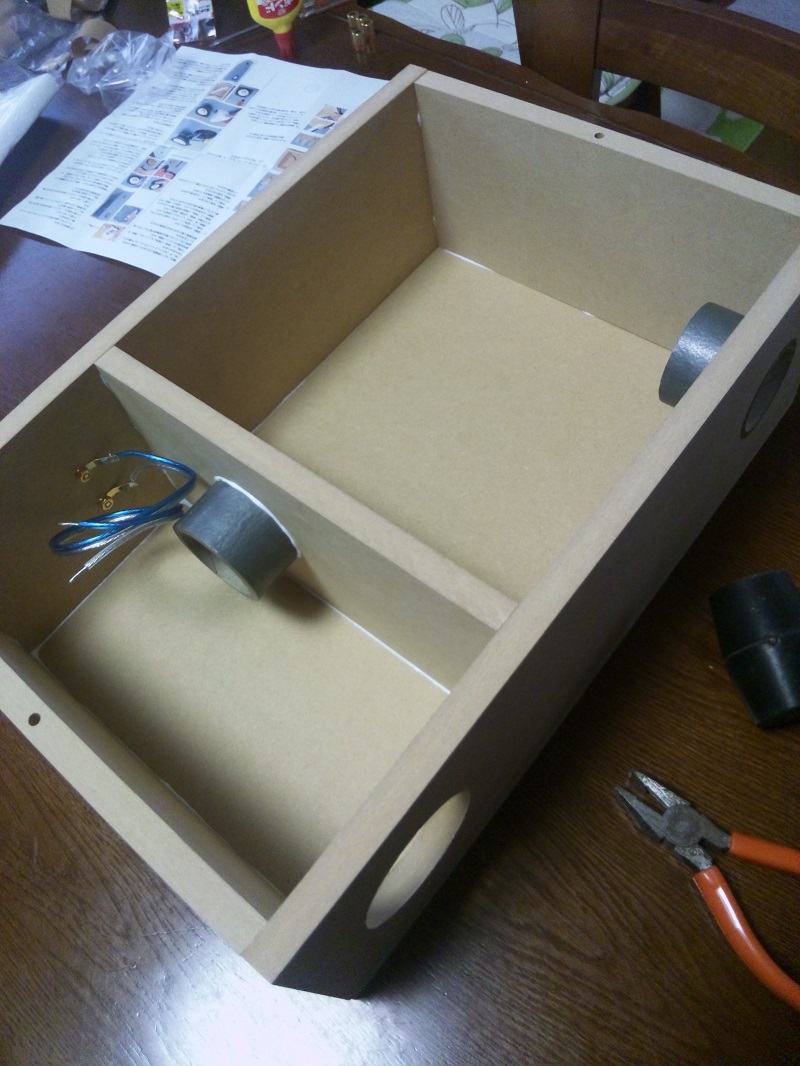エレキットさんのダブルバスレフキットです。いつものようにダクトには鉛テープを巻き、第2空気室には写真撮影後底面に吸音材を貼り付けました。
