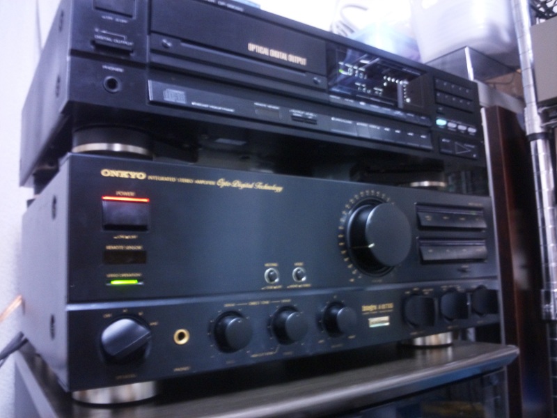 CDPにKENWOOD DP-990SGを使い、ONKYOのジャンクCDPから部品取りしたXスタビライザー(X字のおもり)をアンプの上に乗っけて、RCAは適当に手元にあったケーブルで再生開始! ……ん? 音が出ない。アンプのヘッドフォンから試し出ししていたのですが、さっぱり音が出ない。なんだっちゃ?