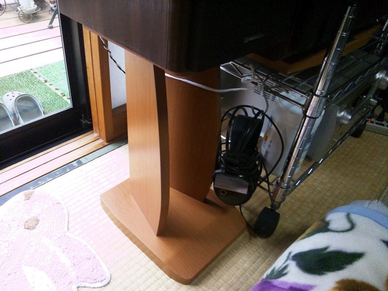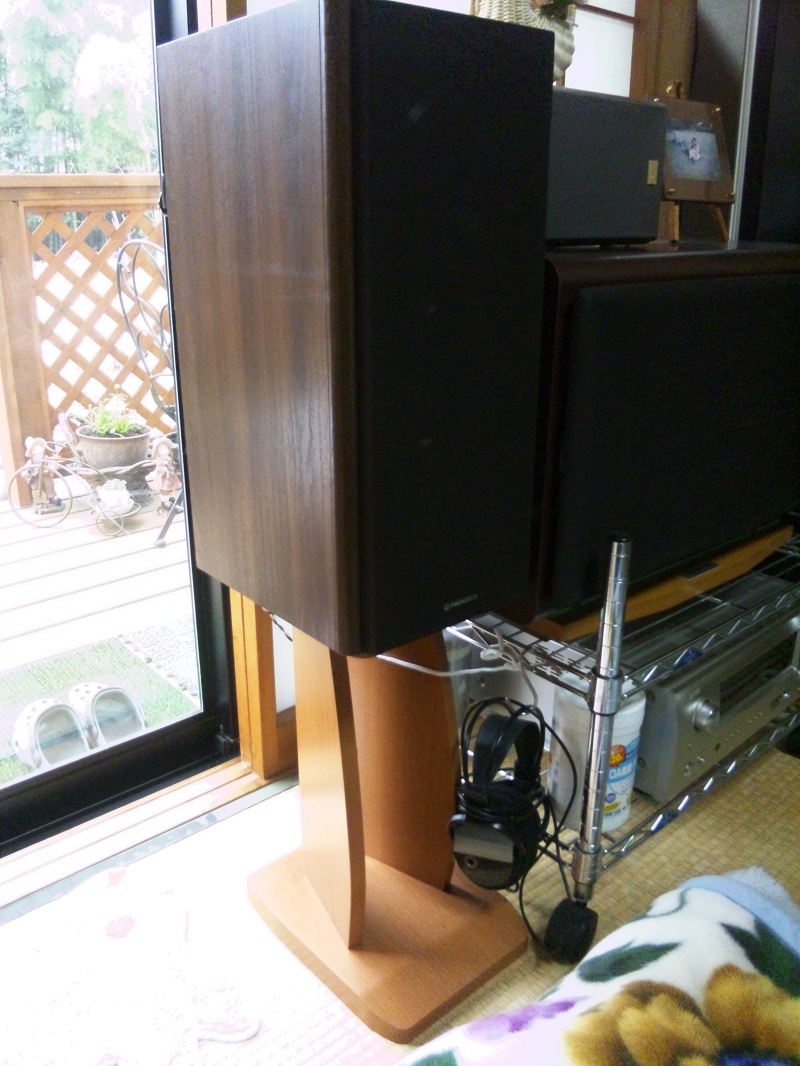 以前父が自作したスタンドに乗っけて試聴中。