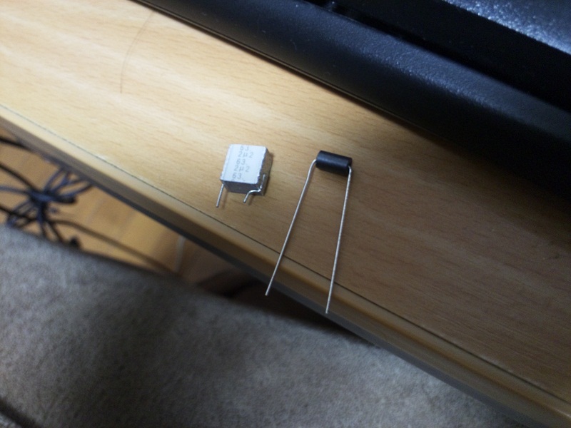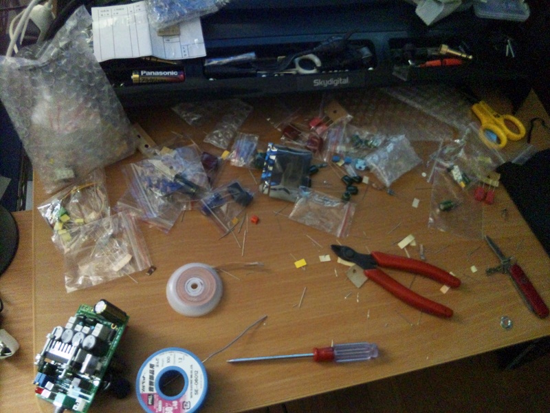 ・4オームコンデンサキット→六個あるちっこいのが、インダクタ後ろの本来ならば黄色い四角いやつがはいる場所に。 オレンジ色のが、TA2020前のキシリトールガムみたいなやつと、青い四角いやつと交換。灰色の四角いのは、インダクタと抵抗の後ろにあるキシリトールガムみたいなのと交換
