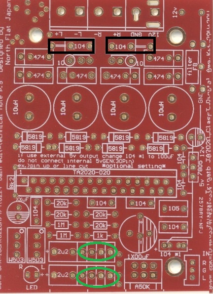 ②DALI抵抗を使ってみようって人→でっかい二本は、立てて使う抵抗(SP出力近くの丸い印刷がある抵抗の場所) 小さい4本は20kの抵抗を入れるところ 一本だけ別になっているのは、TA2020横の8.2kのとこと交換します。 背の低い順番からということで先に金属抵抗つけてしまうと取り外しとかでひどことに……