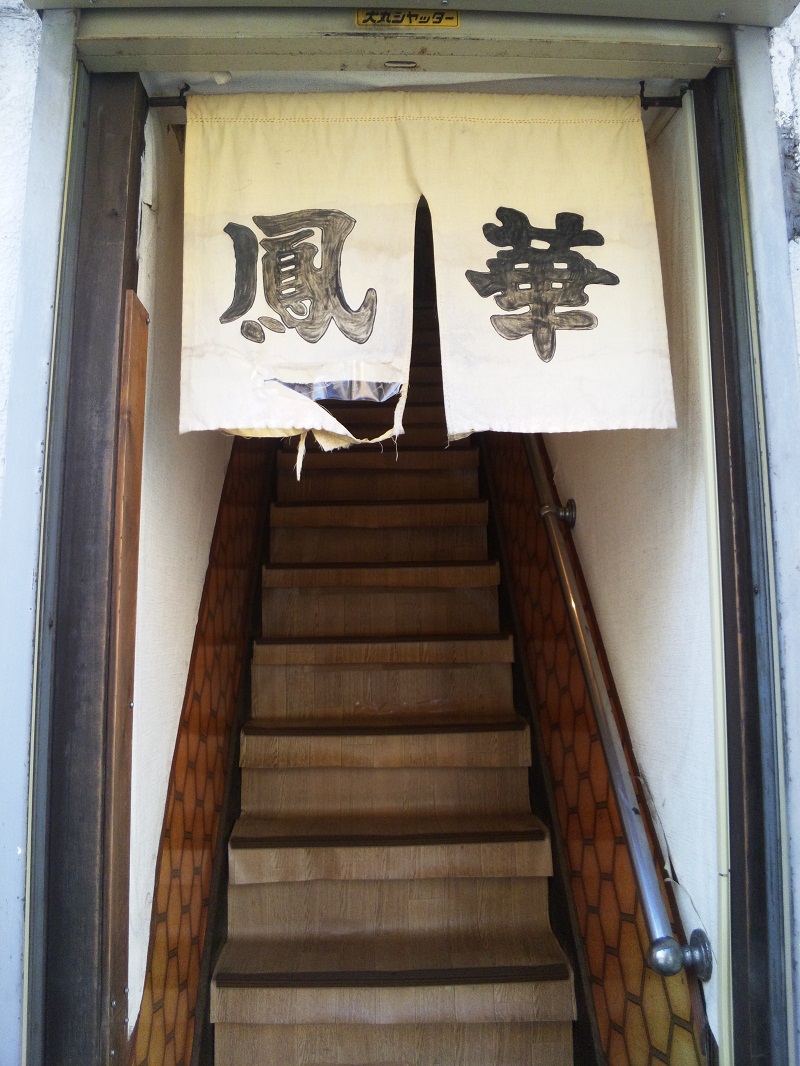すると、十字路の角に現れたのはいかにもって感じの暖簾。入口にはランチタイムの文字が……よし、勇気を振り絞ろう。これも社会復帰の一つさ! というわけでピッチの狭い階段を上がって行きます。