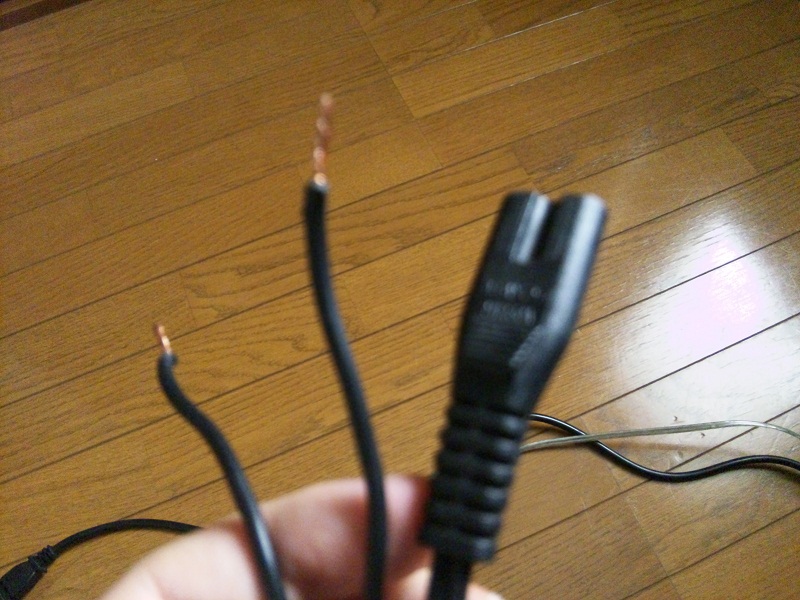 そこで登場するのが、以前Panasonicの電源プラグのために先っぽをバサリとカットしたこのメガネ電源ケーブル。